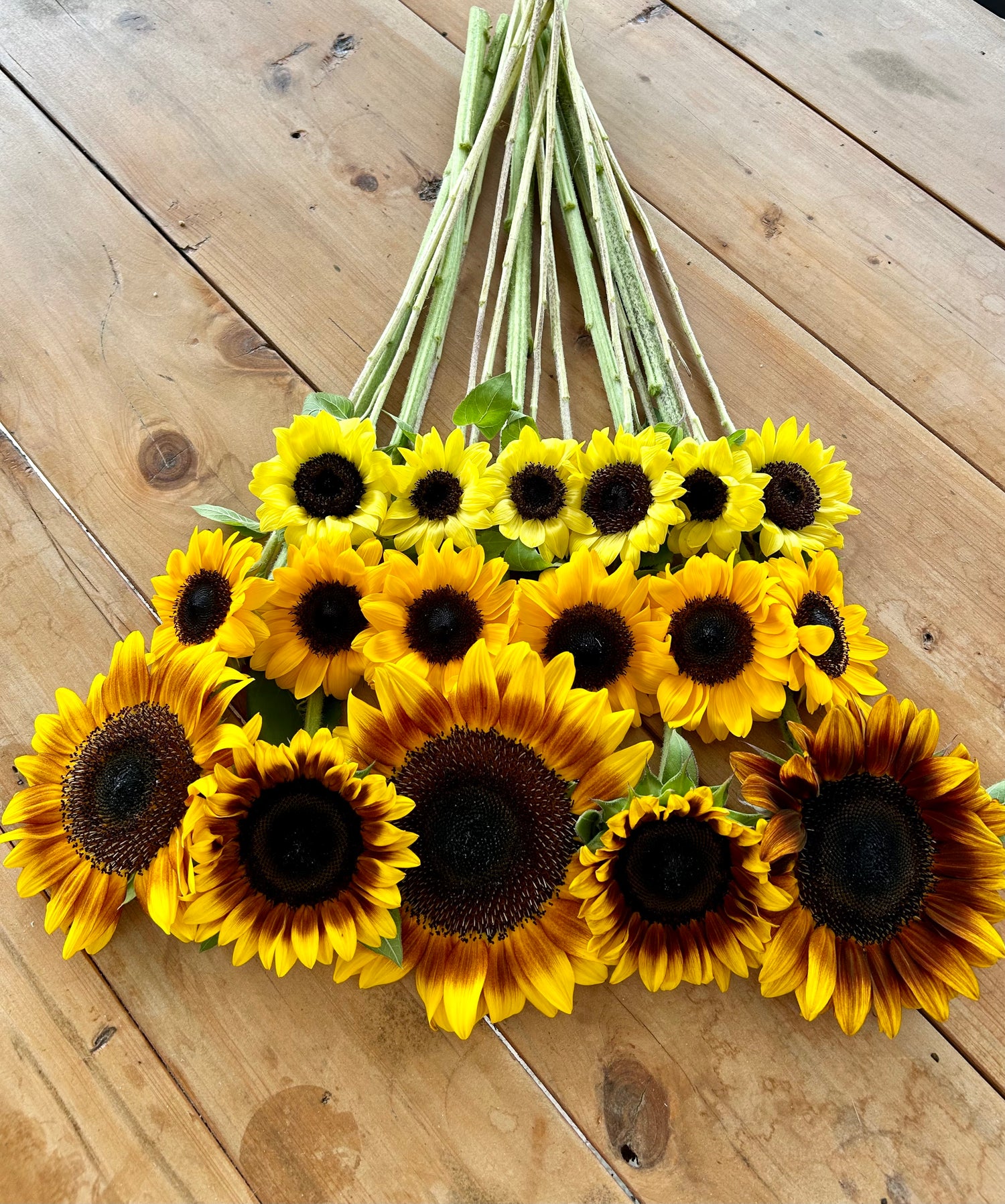 Available flowers change regularly. We have many colors and varieties of sunflowers, zinnias, dahlias, celosia and more beautiful blooms.